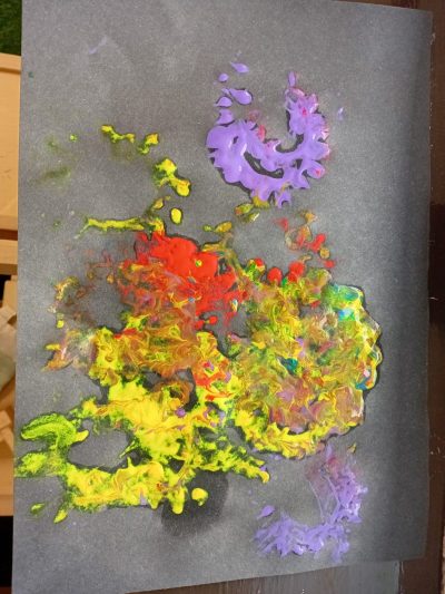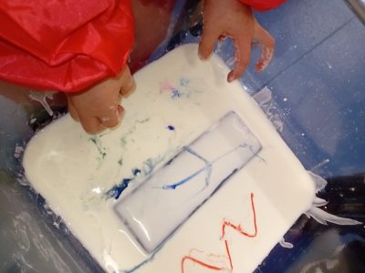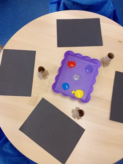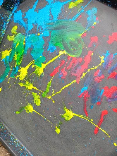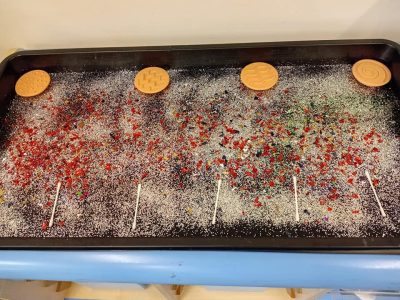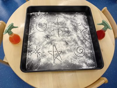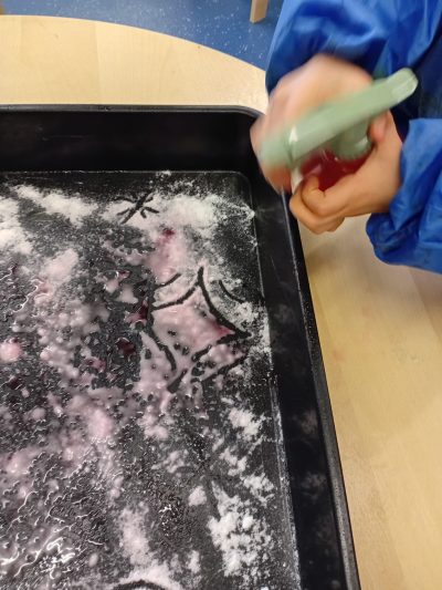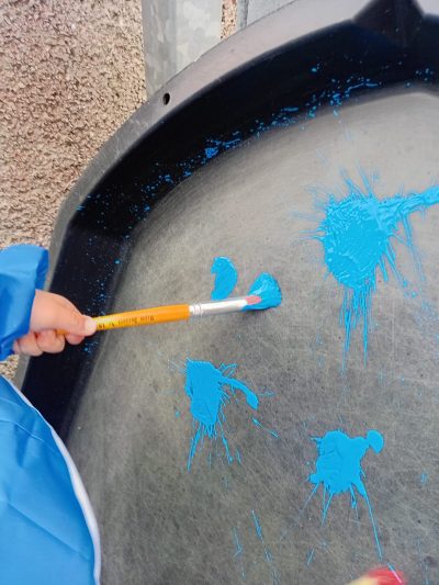 We began the week by taking our fireworks art outdoors, using paintbrushes to flick, splat, and swirl bright colours across the tuff tray to create a spectacular fireworks display!