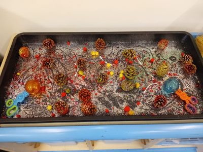 Inside, we worked on our fine motor skills with sparkly glitter patterns, using cotton buds to trace and design shapes that shimmered beautifully in the light. Our bonfire sensory tray was a huge hit too, children used tweezers and scissor pods to scoop, sort, and “pull out” fiery pom poms and pinecones, practising coordination and patience as they played.