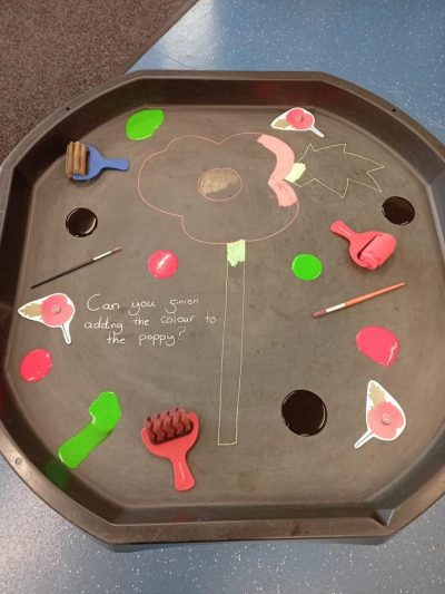 We began by working together to build a giant poppy, carefully filling in the spaces and matching colours from the paper poppies in the tray. The children showed wonderful cooperation and focus, proudly seeing their big red flower take shape! 🌺