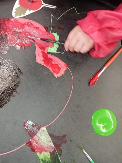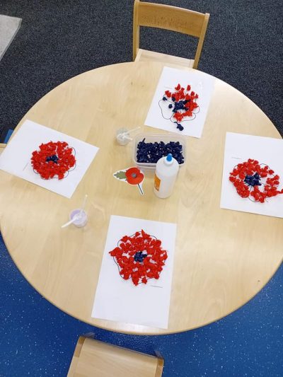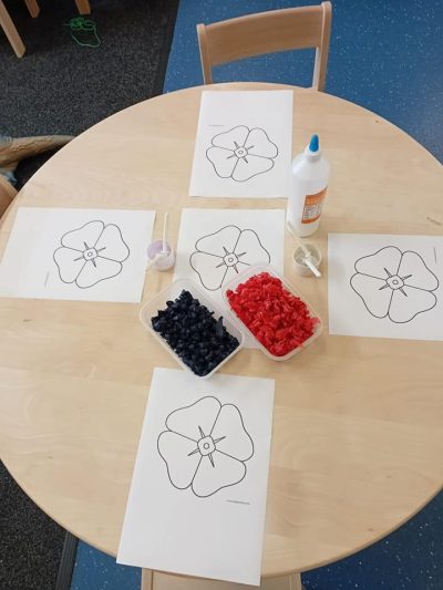 Later on, our creativity continued with tissue paper poppies. Using tiny tissue paper balls, the children filled their poppies with bright reds and deep blacks, chatting happily as they named the colours in both English and Welsh, what clever little learners! 🏴🖍️