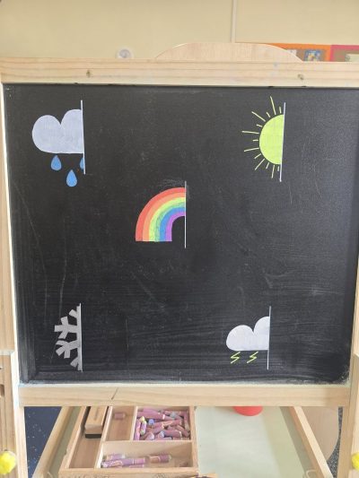 Our creative streak continued with lightning clouds made using zig-zag patterns, sunshine play dough with spaghetti rays and rainbow stars, and delicate weather threading to practise fine motor skills. On the chalkboard, the children tackled a symmetry challenge, completing the other halves of weather pictures with impressive concentration!
